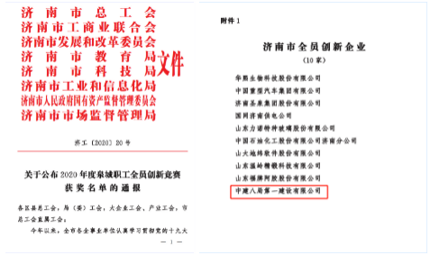 近日,山東省總工會、濟(jì)南市總工會相繼發(fā)布《關(guān)于公布 2020 年山東省全員創(chuàng)新企業(yè)的通知》和《關(guān)于2020年度泉城職工全員創(chuàng)新競賽獲獎名單的通報(bào)》,公司共榮獲5項(xiàng)獎項(xiàng),分別是“山東省全員創(chuàng)新企業(yè)”、“濟(jì)南市全員創(chuàng)新企業(yè)”、“濟(jì)南市創(chuàng)新型班組(綠色產(chǎn)業(yè)園新型模架工廠班組)”、“濟(jì)南市創(chuàng)新能手(張軍)”、“濟(jì)南市職工優(yōu)秀技術(shù)成果”。