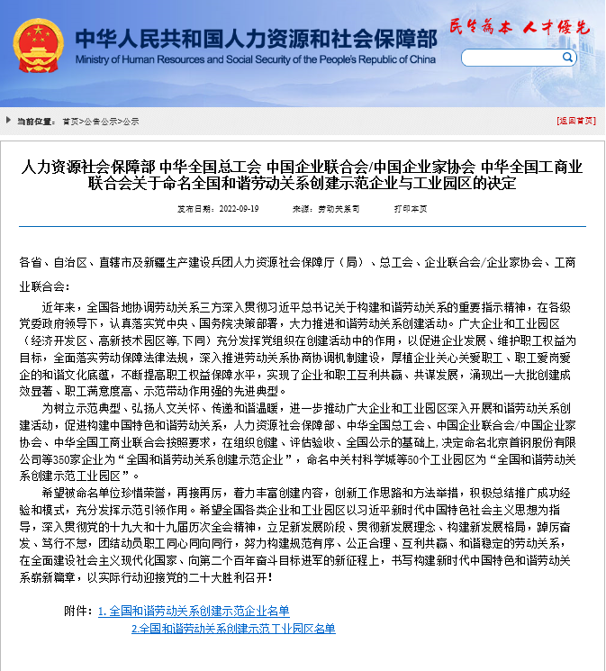 近日,人力資源和社會保障部、中華全國總工會、中國企業(yè)聯(lián)合會/中國企業(yè)家協(xié)會、中華全國工商業(yè)聯(lián)合會聯(lián)合印發(fā)關(guān)于命名全國和諧勞動(dòng)關(guān)系創(chuàng)建示范企業(yè)與工業(yè)園區(qū)的決定。