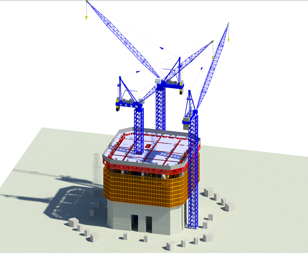 項目因此計劃研發(fā)智能化整體提升平臺施工。該頂升平臺能夠?qū)崿F(xiàn)施工集成,將施工電梯直達平臺、卸料平臺、混凝土布料溜管、臨時設施、物料堆場等與平臺的融合,優(yōu)化資源配置,減少設備之間運行的干擾,提升施工速度;利用墻體預埋鋼盒,油缸支撐系統(tǒng)附著墻體,保證平臺承載力,同時可抵御高空風荷載作用。通過優(yōu)化設計,外掛架開合伸縮機構,解決墻體內(nèi)收、傾斜、伸臂桁架、預埋附墻件等復雜情況下的平臺爬升;全方位實時監(jiān)控平臺工作運行狀態(tài),具有預警功能。